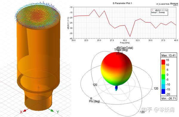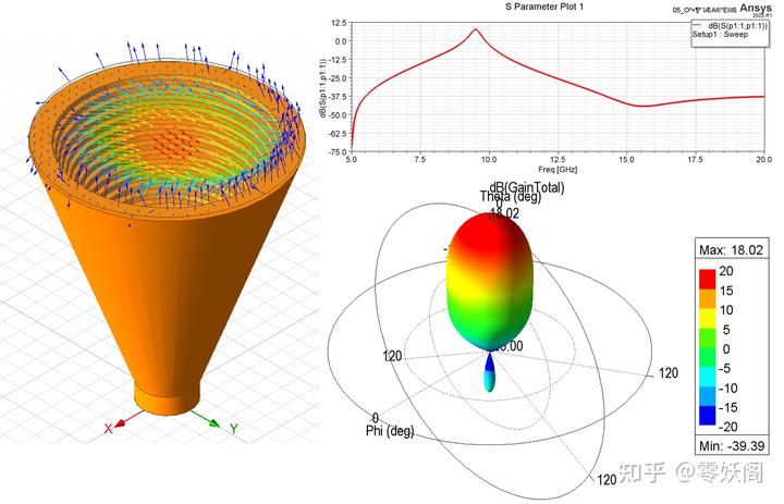 下圖給出了圓錐波紋喇叭天線的仿真結果。
