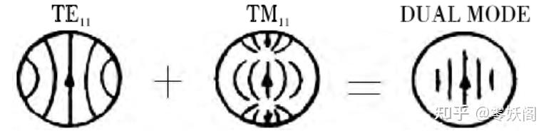 雙模圓錐喇叭通過引進一個高次模 TM11 模來改善 $E$ 面方向圖,使其方向圖具有軸對稱的等化波束特性。下圖是圓波導中主模 TE11 模和高次模 TM11 的口徑電場分布及其合成后的口徑場分布示意圖。